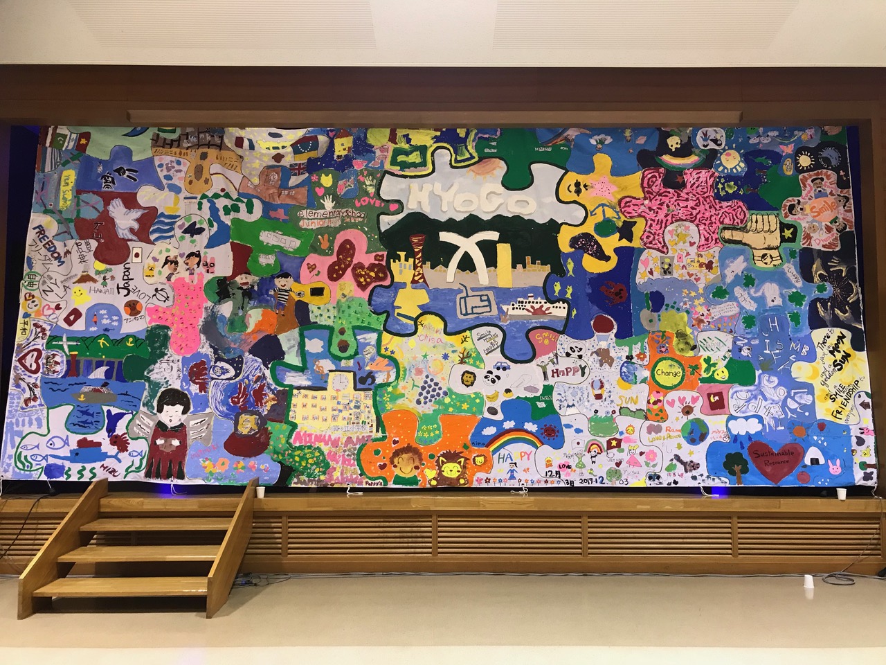 A wonderful peace painting was created by children and foreign students from Asia and Africa such as Zambia, Togo, South Africa and Vietnam at Hyogo International House in Kobe. “Coexistence” was the main theme of this painting and each participant made his /her own painting on a jigsaw puzzle shapes. At first, they discussed with facilitators to decide the composition of this huge painting. There is a symbol of Kobe City in the center and other part of the canvas was filled with each one’s wish for peace. This painting shows coexistence of differences rather than uniformity.